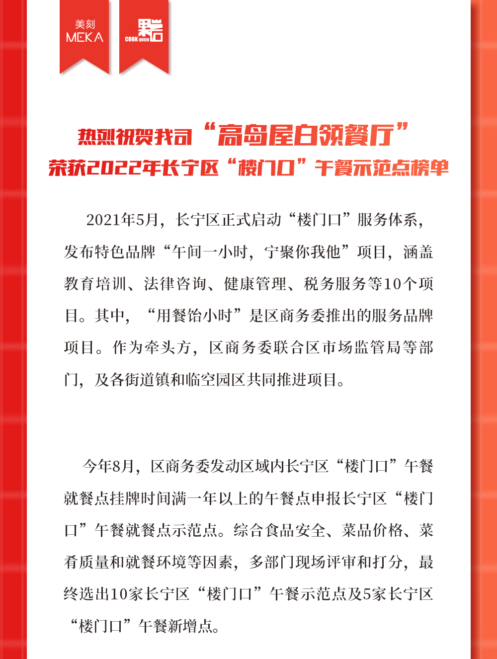 热烈祝贺我司“高岛屋白领餐厅” 荣获2022年长宁区“楼门口”午餐示范点榜单